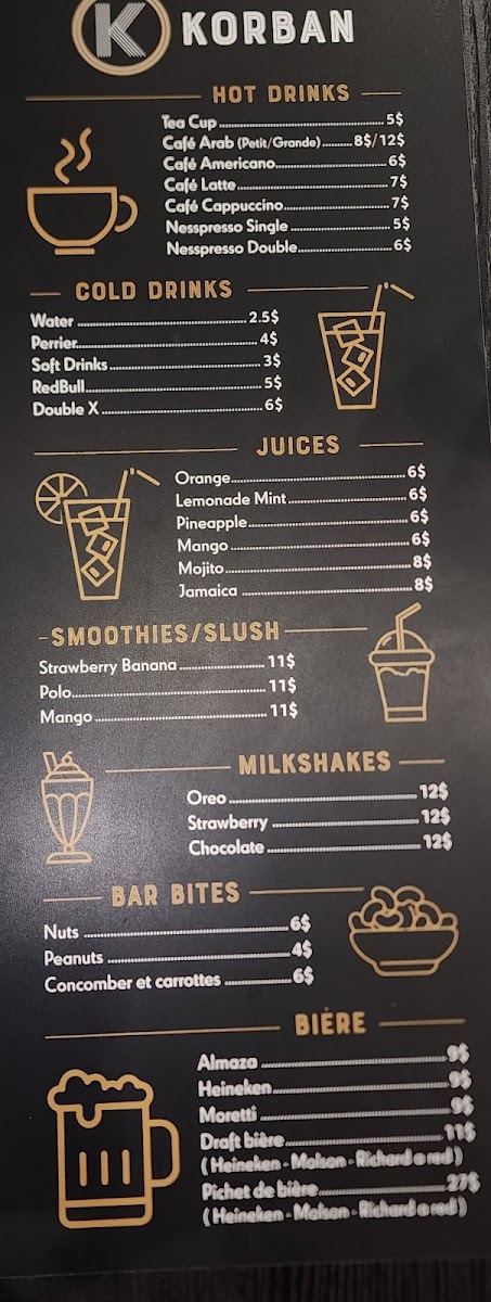 The menu at Korban Resto Lounge features a tantalizing array of hot drinks, smoothies, and signature dishes that are bound to satisfy any palate. Start your journey with a cup of expertly brewed coffee – whether it's a rich Café Americano or a creamy Café Latte, each sip is crafted to perfection. And don’t forget to try their smooth Strawberry Banana and Mango smoothies, an ideal complement to your meal, priced at just CA$11.00.